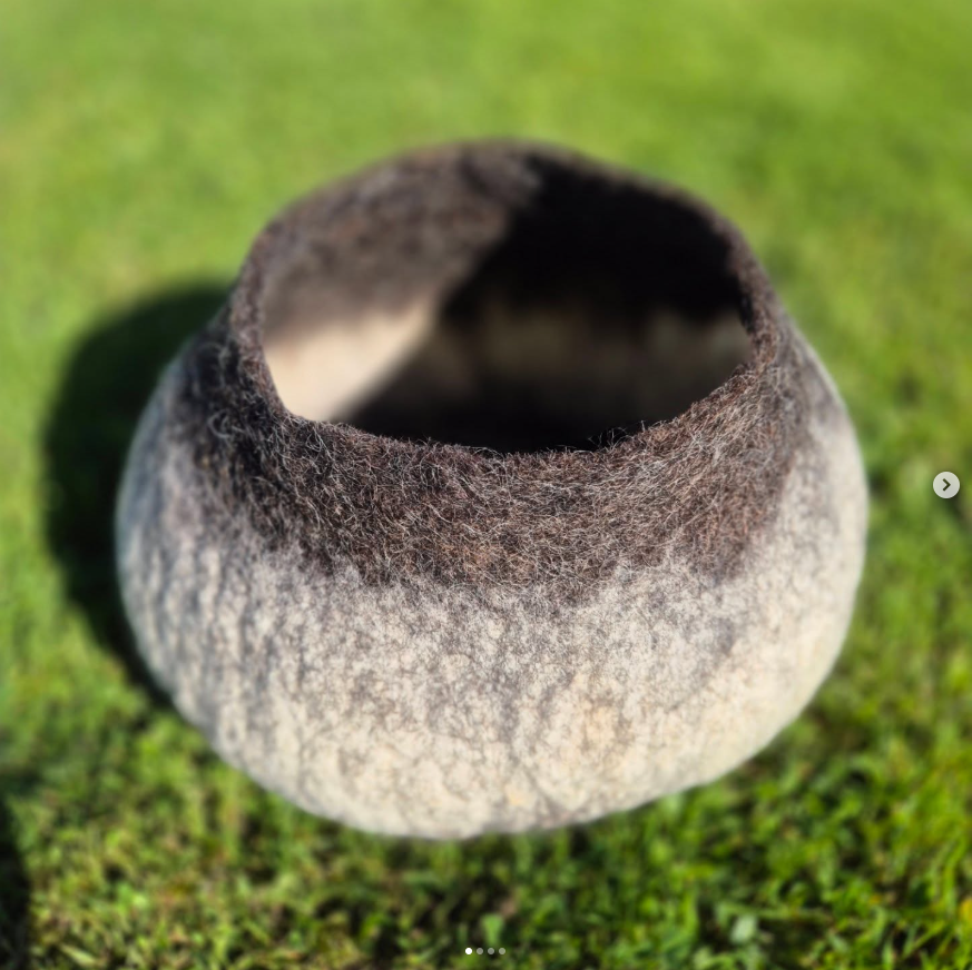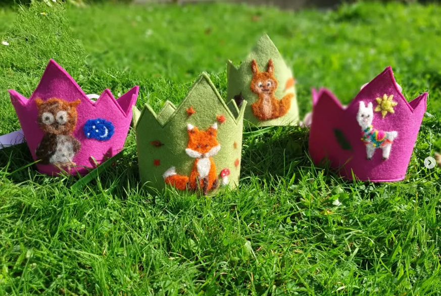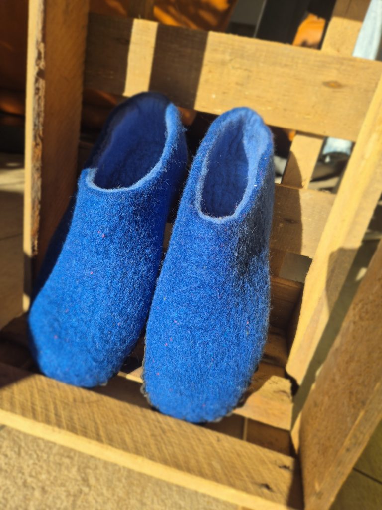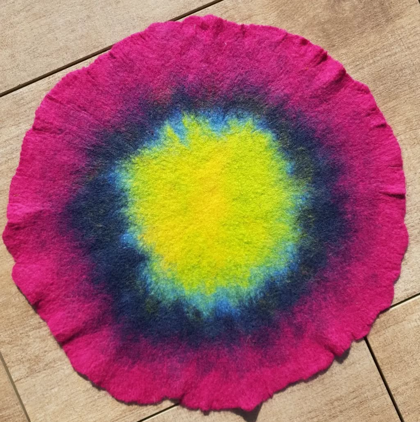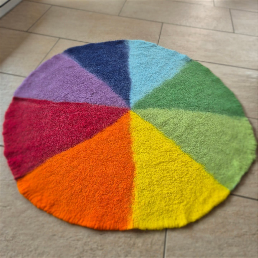 Puschen aus Bergschaf mit EchtledersohleRegenbogenteppich für eine Pekip-LeitungSpieleteppichVeggiefelle, für dieses Sitzfell musste kein Tier sterben. Statt der Haut ist auf der Unterseite von mir Wolle gegengefilzt.SitzkissenSchultüten, auch mit der Mutter zusammen in einem Projekt kann gefilzt werdenSaunahüte – damit ist man in der Sauna auf jedenfall ein HinguckerSaunahüte schützen vor Überhitzung und sie sind Schutz für die Haare, mein Mann liebt es mittlerweile auch (er hat keine Haare)HandpuppenGefäßeWunderbare Schals aus Merino und Seide, handgefärbt Geburtstagskronen